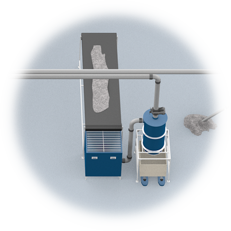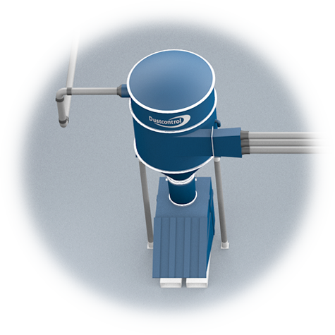 Das Saugsystem muss immer mit einem Staubabscheider ausgerüstet sein. Der Staubabscheider scheidet grobes Material in einem Zyklon und den feinen Staub in gefalteten konischen Filtern ab, die im Zentrum des Zyklons angebracht sind. Die Filter haben im Verhältnis zu ihrer Mantelfläche eine große Filterfläche, wodurch die Staubabscheider verhältnismäßig klein gehalten werden können. Gewöhnlich werden die Staubabscheider mit Plastiksäcken ausgerüstet, die das abgeschiedene Material auffangen. Es können aber auch viele weitere Arten von Auslasseinheiten angebracht werden.