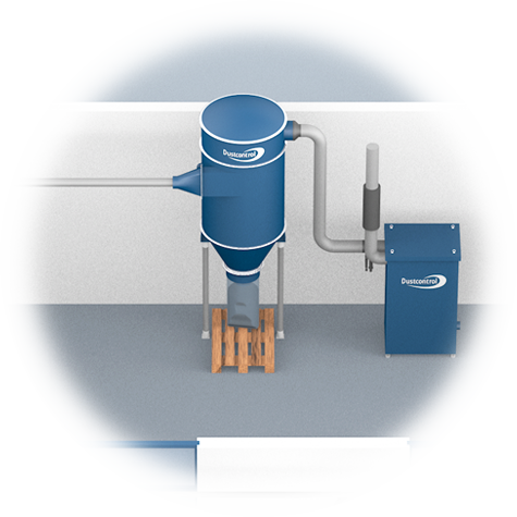 Vorabscheider finden ihre Anwendung bei der Abscheidung von grobem Material und großen Materialmengen. Diese können in der Nähe des Arbeitsplatzes, z.B. zur Wiedergewinnung oder platzsparend bei der Zentraleinheit aufgestellt werden. Der Vorabscheider arbeitet dynamsch, d.h. dass durch Umlenkung der Luft das Material aus dem Luftstrom herausgeschleudert wird. Dies kann in einem Zyklon oder in einer sogenannten Staubkammer geschehen. Die Staubkammer wird gewöhnlicherweise wie ein Container mit Aus- und Einlass an einer der beiden Schmalseiten versehen. Da der Vorabscheider eingesetzt wird, um gröbere Materialmengen zu bewältigen, ist es auch von Bedeutung das entsprechend richtige Austragssystem zu verwenden. Dustcontrol hat eine Vielzahl von Standard- lösungen, wie z.B. Schleusenaustrag, Schraubenförderer, etc.
